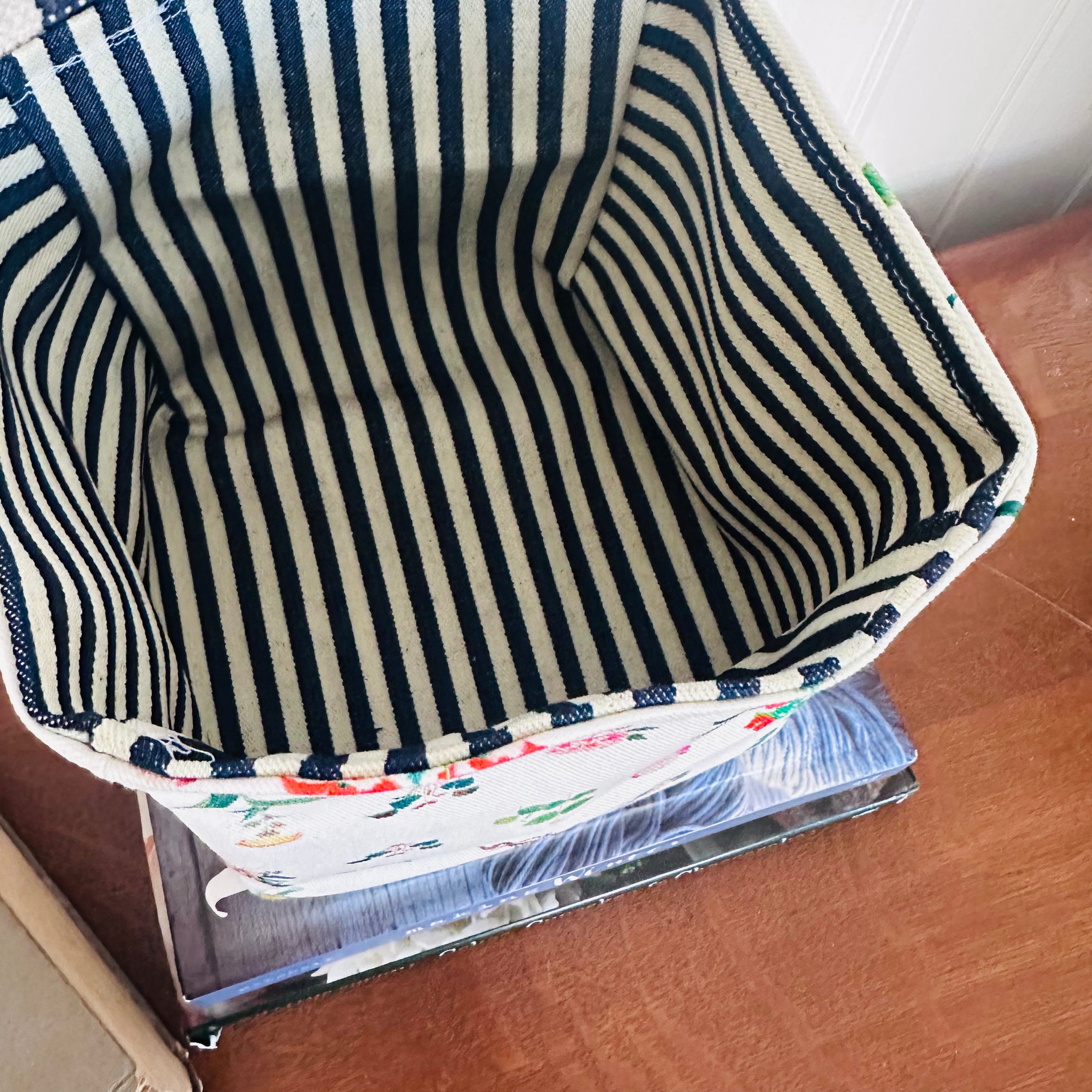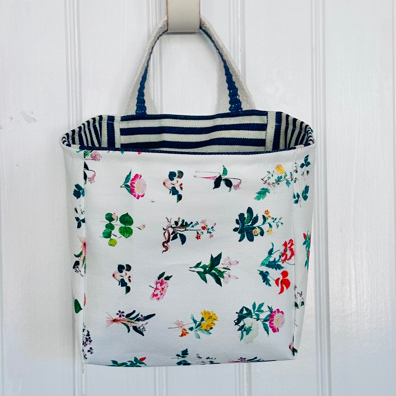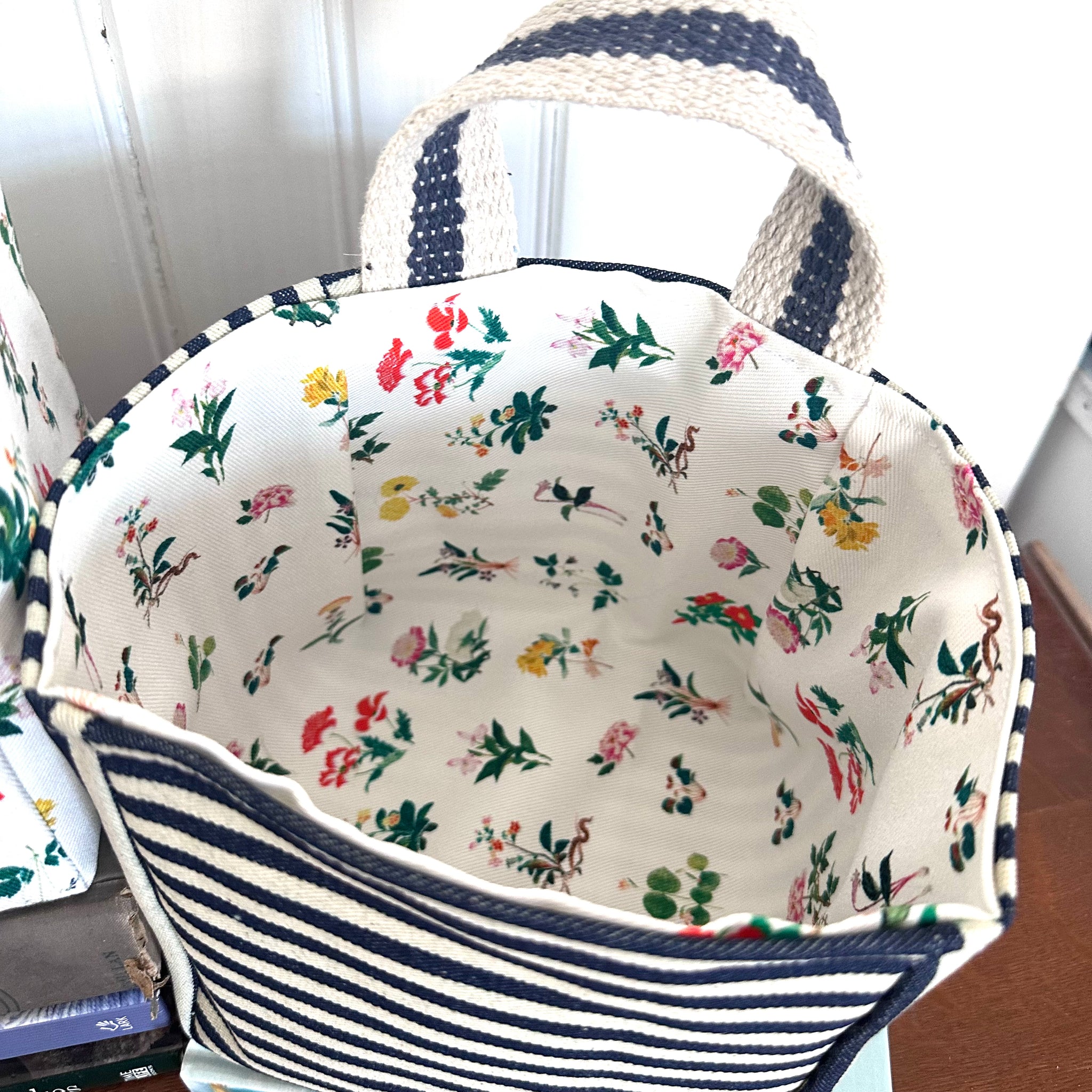Reversible in French denim stripe and Italian floral.