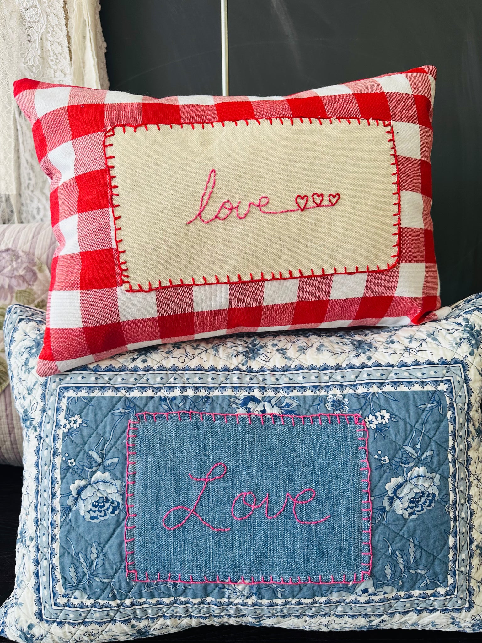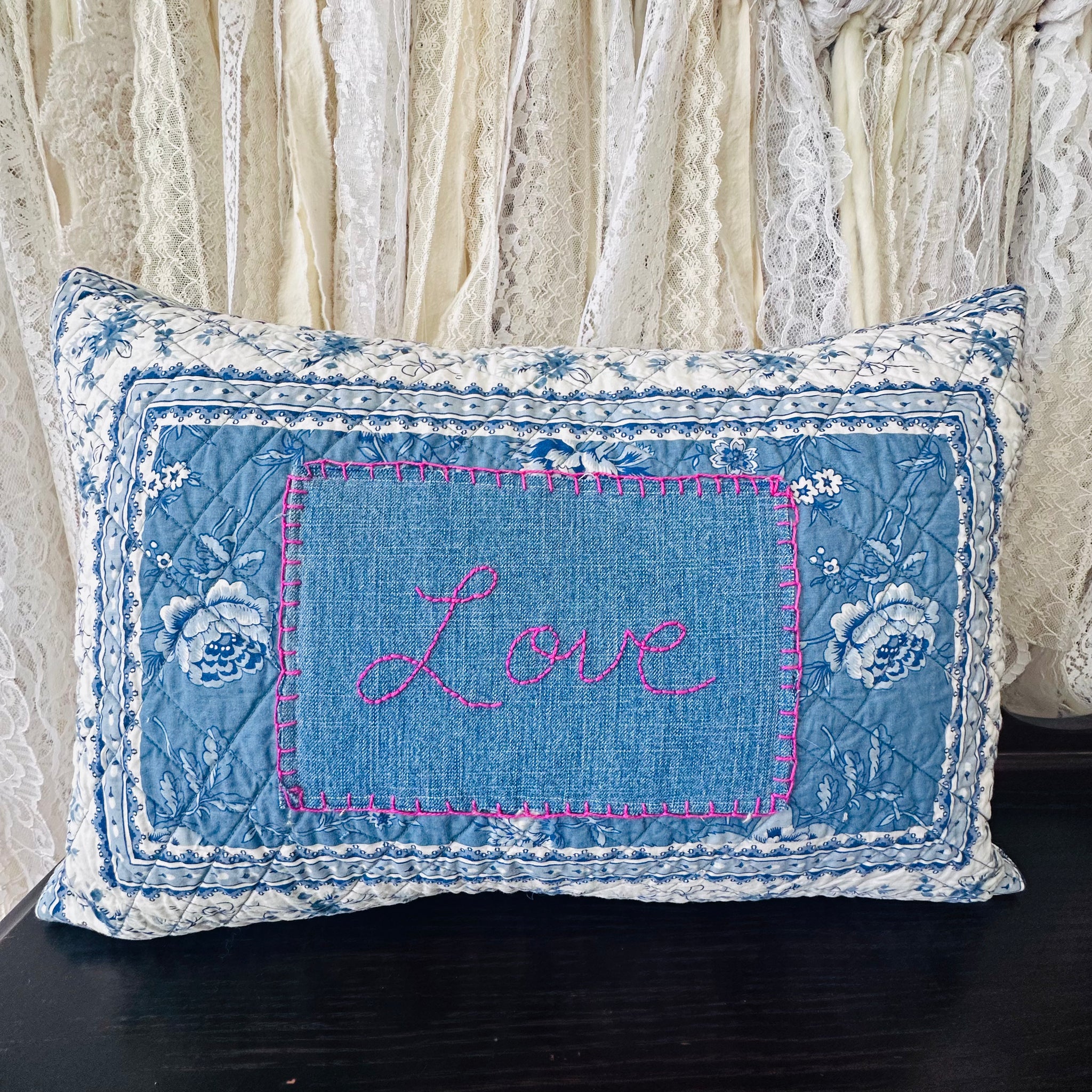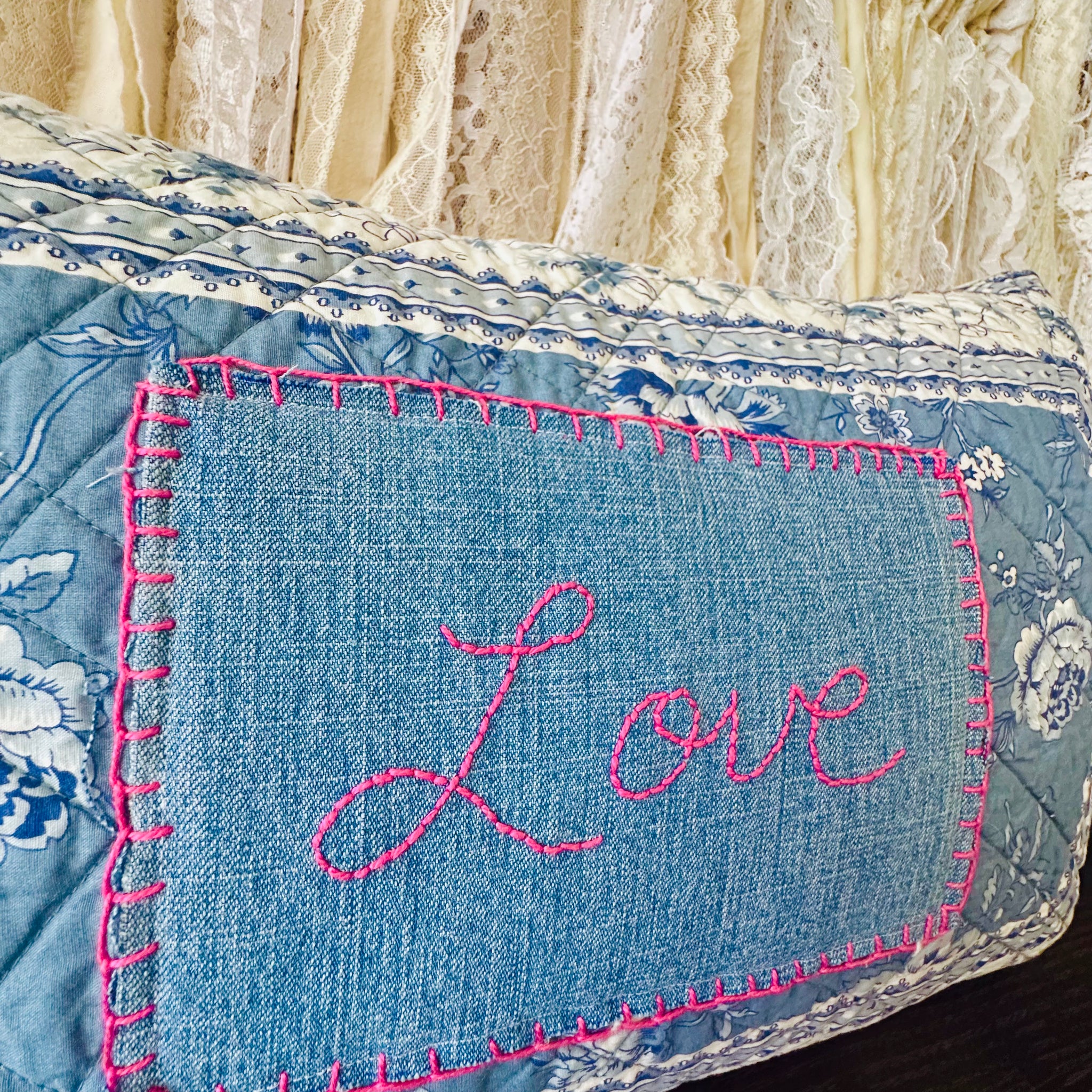 Gand embroidery onto denim and appliquéd onto William’s and Sonoma quilted fabric.