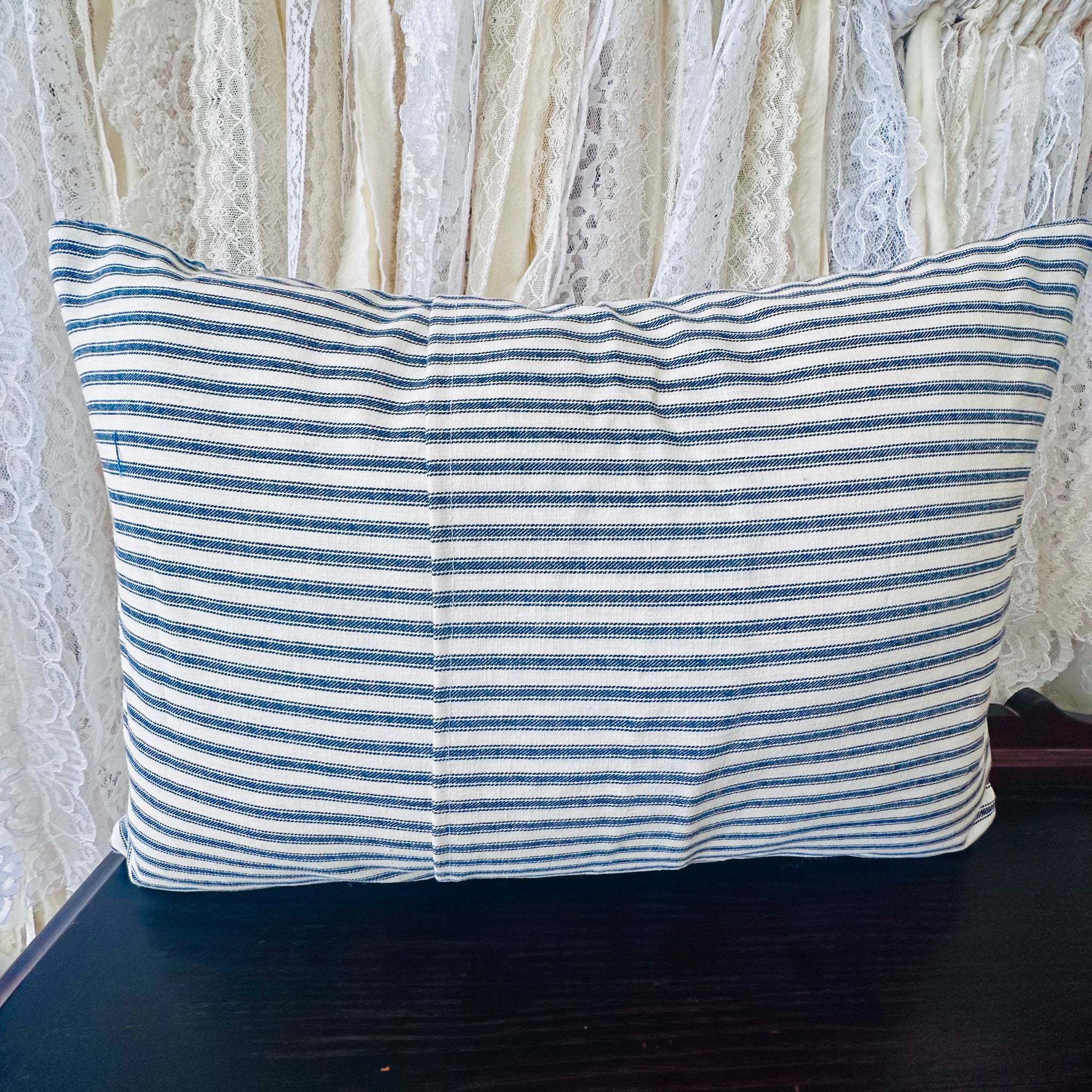 Backing in blue and cream ticking